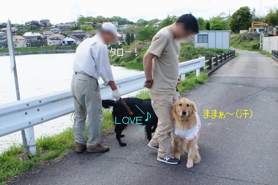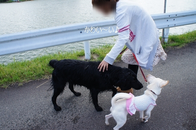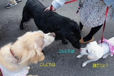 ワンコ達も笑顔いっぱい、元気な、フラットコーテッドのタローちゃんはひとなつこそう。